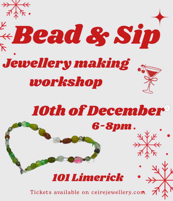 Bead & Sip is back in @101limerick on the 10TH of December for a fun evening of crafting & relaxing. What better way to kick off the holiday season than making your own festive jewellery & memories with friends!💃🎄