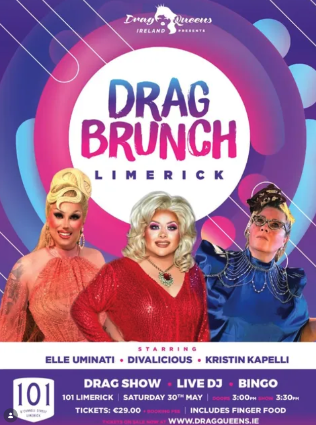 Drag Brunch returns to 101 Limerick on Saturday 30th May for an afternoon of fierce performances, bingo, cabaret chaos and non-stop party vibes. Starring Elle Uminati, Divalicious and Kristin Kapelli, with a live DJ, fabulous prizes and all the outrageous fun you can handle.