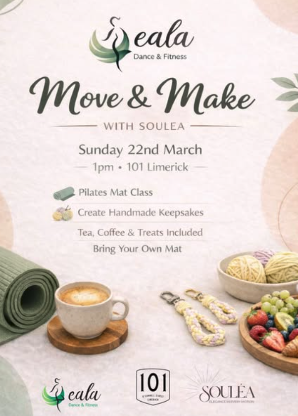Join Eala Dance Fitness at 101 Limerick on Sunday 22nd March at 1pm for a beautiful afternoon of movement, creativity and connection. Begin with an uplifting Pilates mat class, then unwind as you create handmade keepsakes in a relaxed workshop setting – all while enjoying tea, coffee and sweet treats. ☕️🥐